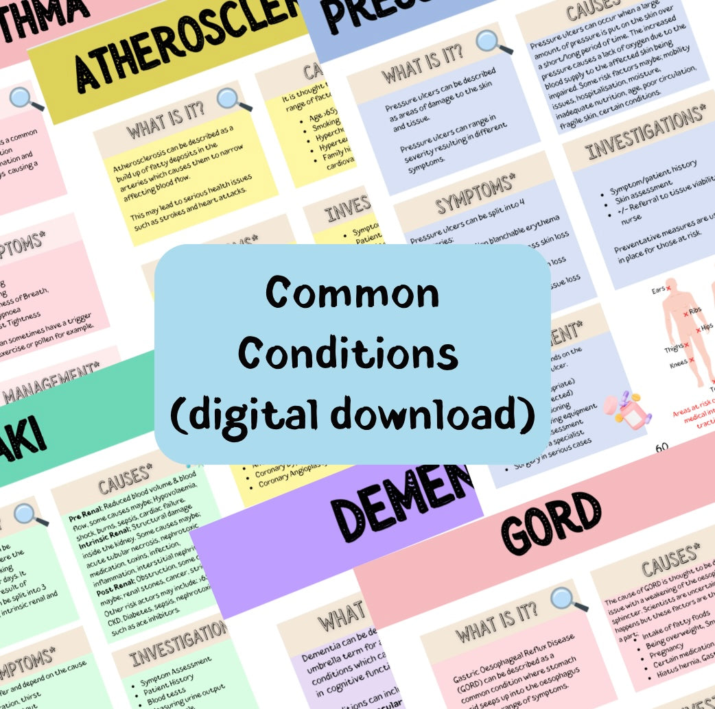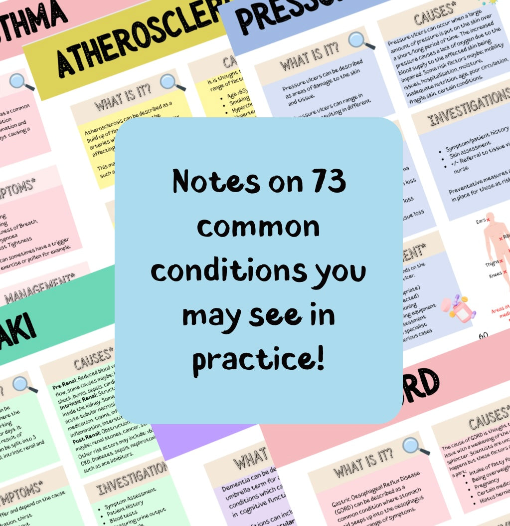 Your go-to companion crafted by an experienced nurse and former clinical educator. This download covers notes on causes, symptoms, investigations, and management for a whopping 73 conditions!