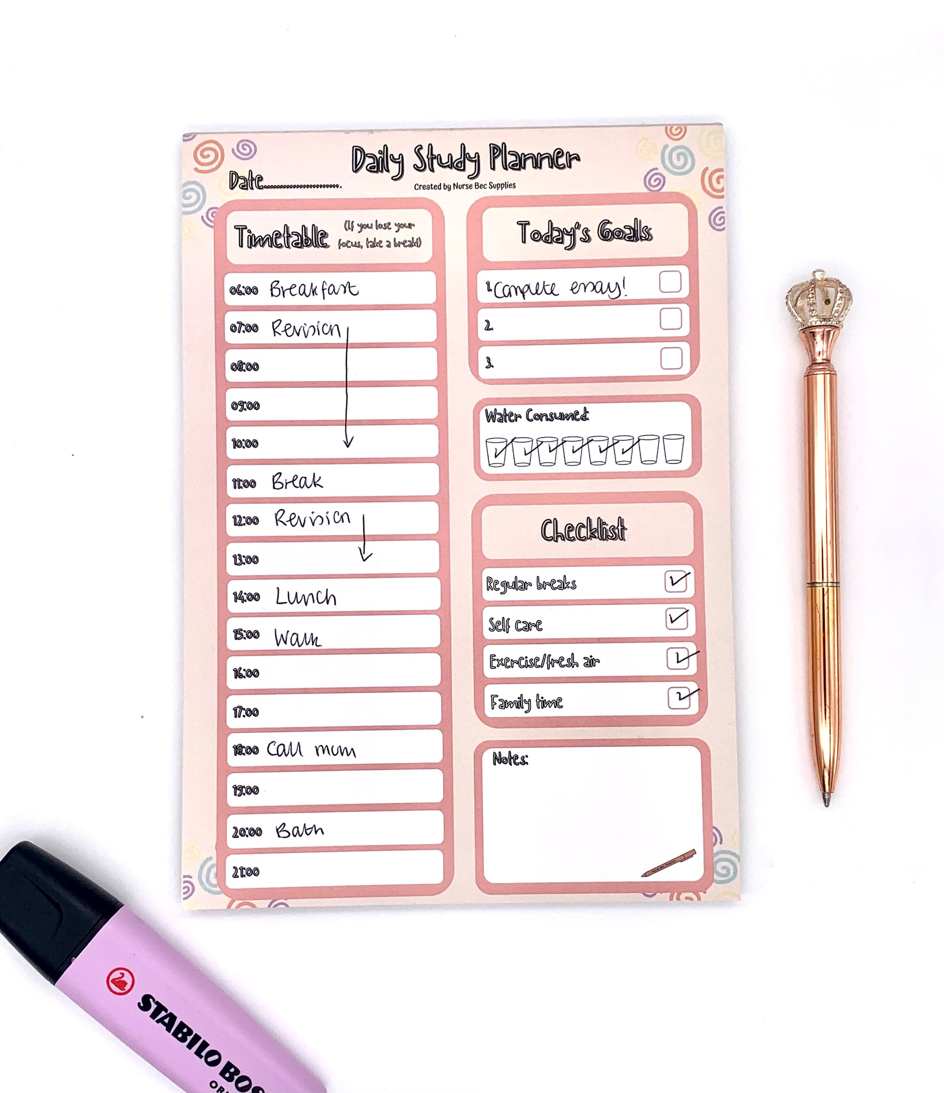 This A5 pad is designed to help make your life easier and keep you on schedule for the day including boxes for you to plan your tasks, goals, track your water intake.